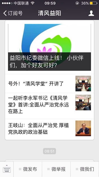 “清风益阳”设置了“微发布”、“微举报”、“微我们”三大栏目。从“微发布”可以链接到益阳纪检监察网的“纪检要闻”、“执纪审查”、“廉洁文化”三个子栏目。这个栏目,不仅密切关注党风廉政建设和反腐败工作热点,还可以让各位微友阅读到益阳本地原创性纪检文艺、理论类美文,积极传递反腐倡廉正能量。