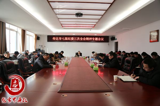 会议介绍了市七届纪委三次全会基本情况,传达学习了市委书记、市人大常委会主任虢正贵在会上的重要讲话和市委常委、市纪委书记、市监委主任袁美南所作的《深入学习贯彻党的十九大精神,以永远在路上的韧劲推动全面从严治党向纵深发展》工作报告。