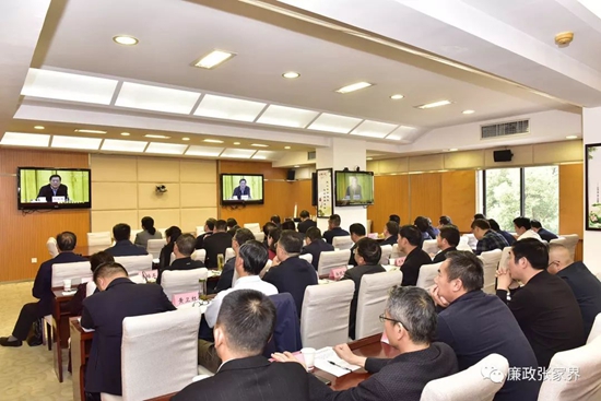 11月4日下午,湖南省召开党员领导干部专题警示教育大会,加强党风廉政建设,推进全面从严治党。会议以电视电话会议形式召开,张家界市设立分会场。虢正贵、刘革安、汪业元、余怀民等市四套班子领导率领全市各部门负责人收看会议。